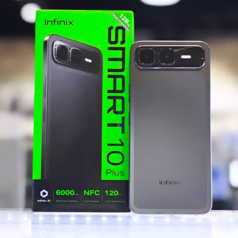 Infinix Smart 10 Plus – 6000mAh – 128GB/4GB (up to 8GB ext) – Android 15 (Go Edition XOS 15.1) – 6.67" HD+ IPS LCD 120Hz, 700 nits – 8MP Rear + 8MP Front – 18W Charge – USB-C – Side Fingerprint – Dual SIM – 4G – IP64 Dust & Water Resistance – Black colour