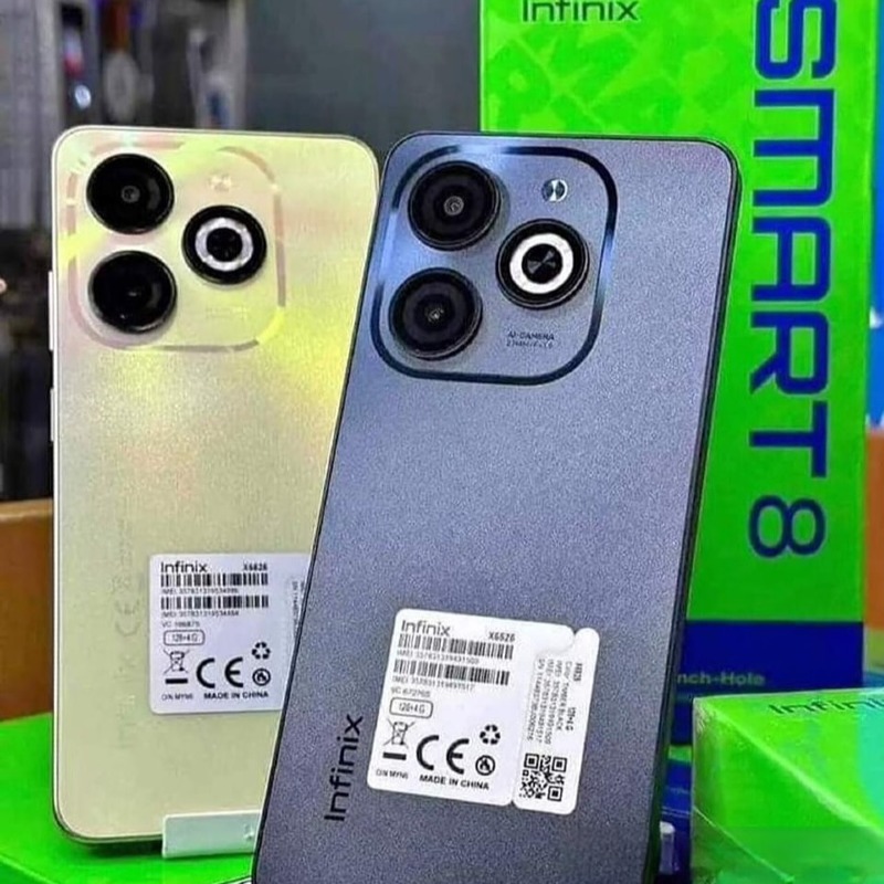 Infinix Smart 8 – 5000mAh – 64GB/3GB – Android 13 (Go Edition) – 6.6" HD+ IPS LCD 90Hz – Unisoc T606 – 13MP Rear + 8MP Front – USB-C – Side Fingerprint – Dual SIM – 4G – FM Radio – OTG Support
