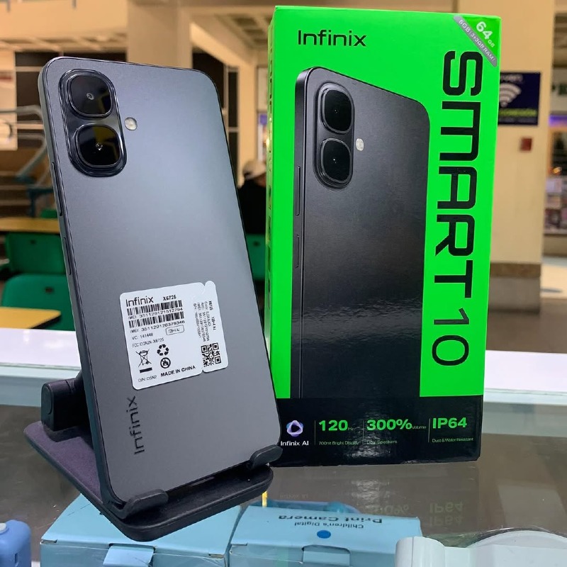 Infinix Smart 10 – 5000mAh – 64GB/3GB – Android 15 (Go Edition XOS 15.1) – 6.67" HD+ IPS LCD 120Hz, 700 nits – 8MP Rear + 8MP Front – 15W Charge + Reverse Charging – USB-C – Side Fingerprint – Dual SIM – 4G – IP64 – FM Radio – Stereo Speakers.