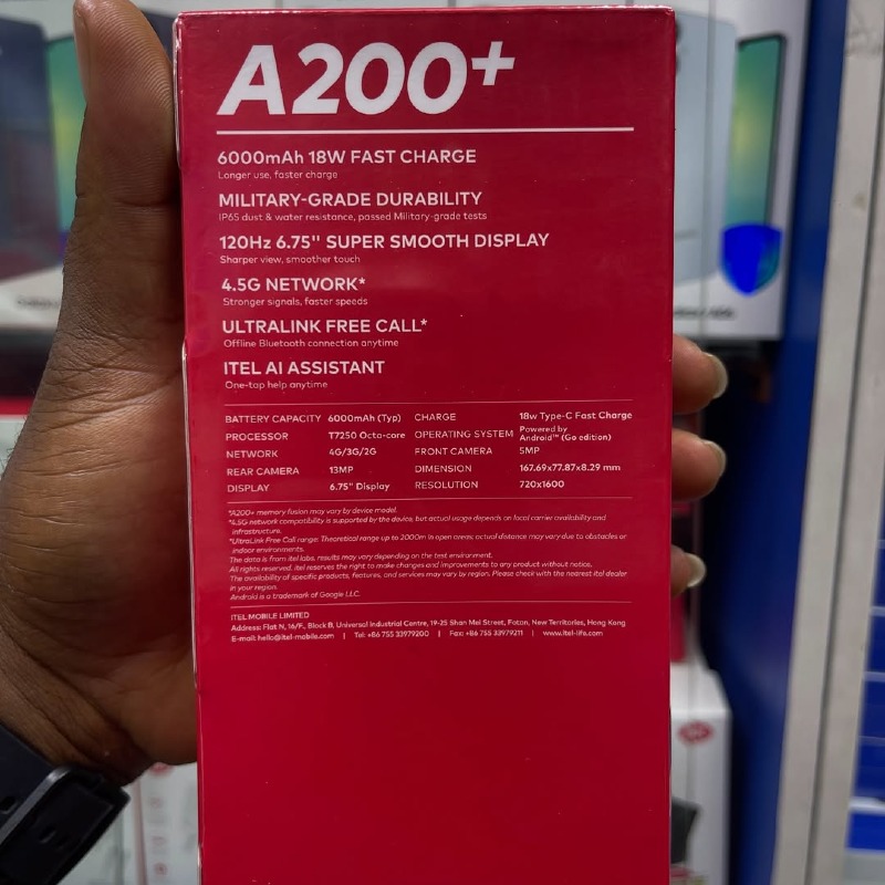 itel A200+ – 5000mAh – 128GB ROM – 3GB RAM – Android – 6.6" IPS LCD – Dual Rear Camera – 5MP Front – USB-C – 4G LTE – Rear Fingerprint – Dual SIM.